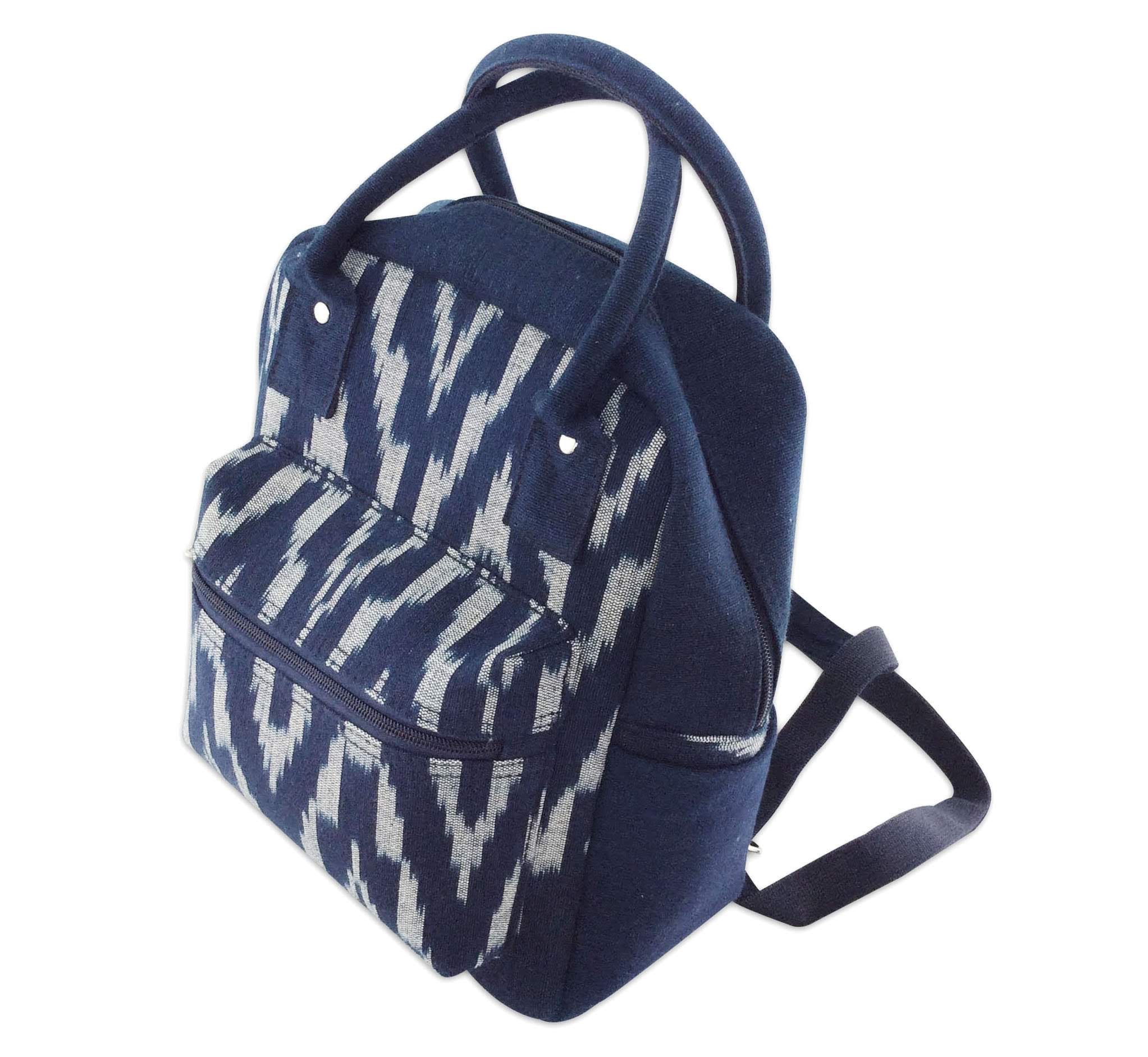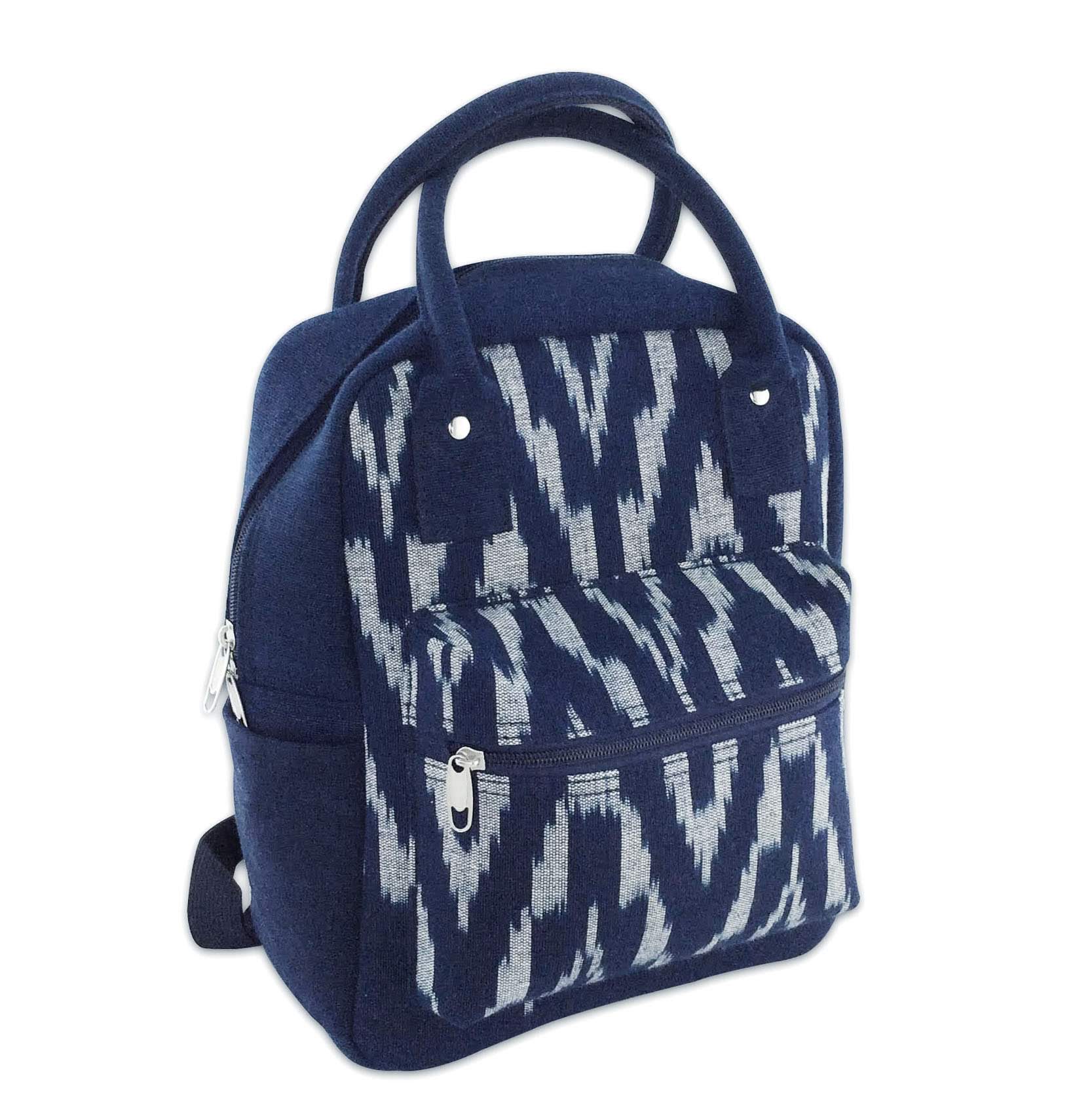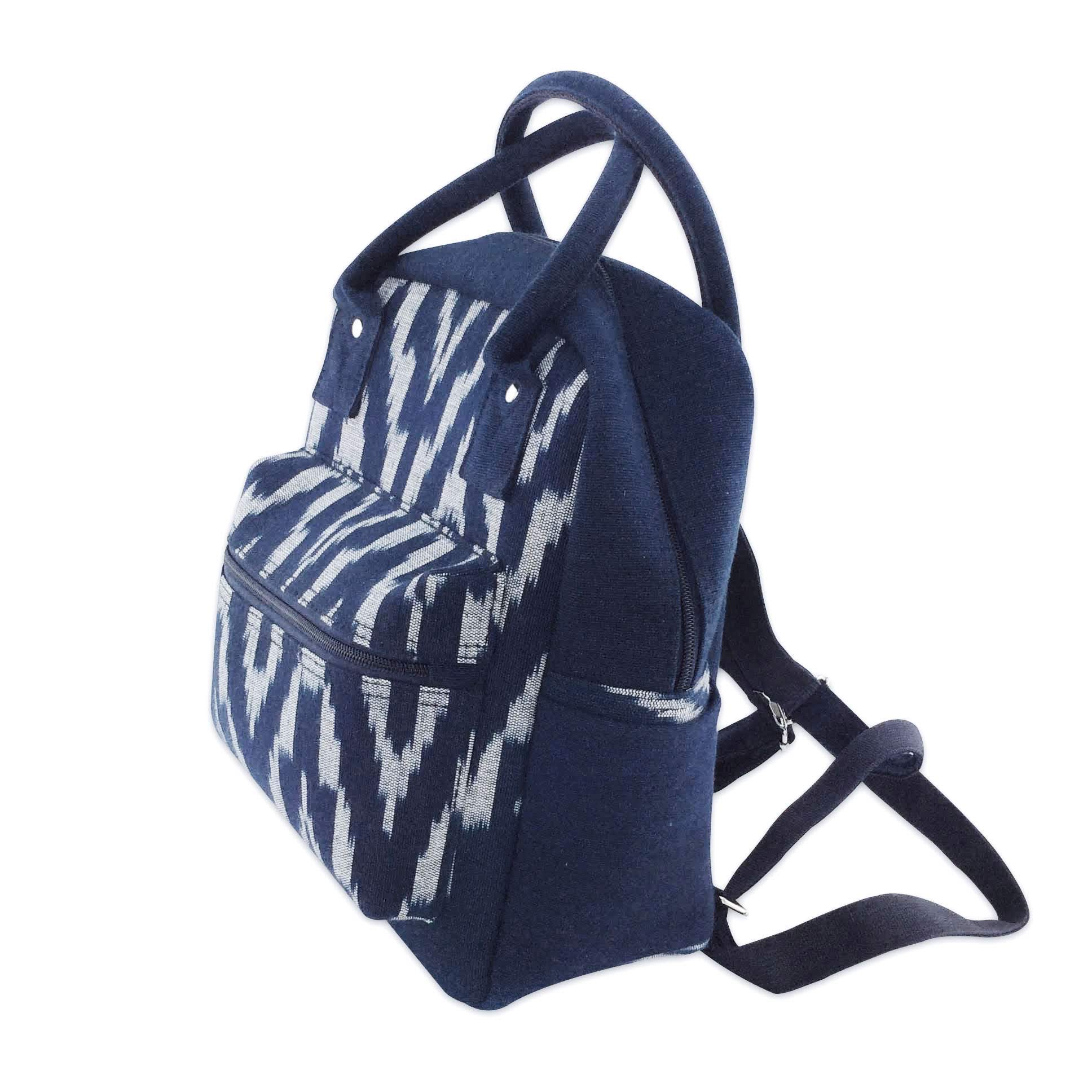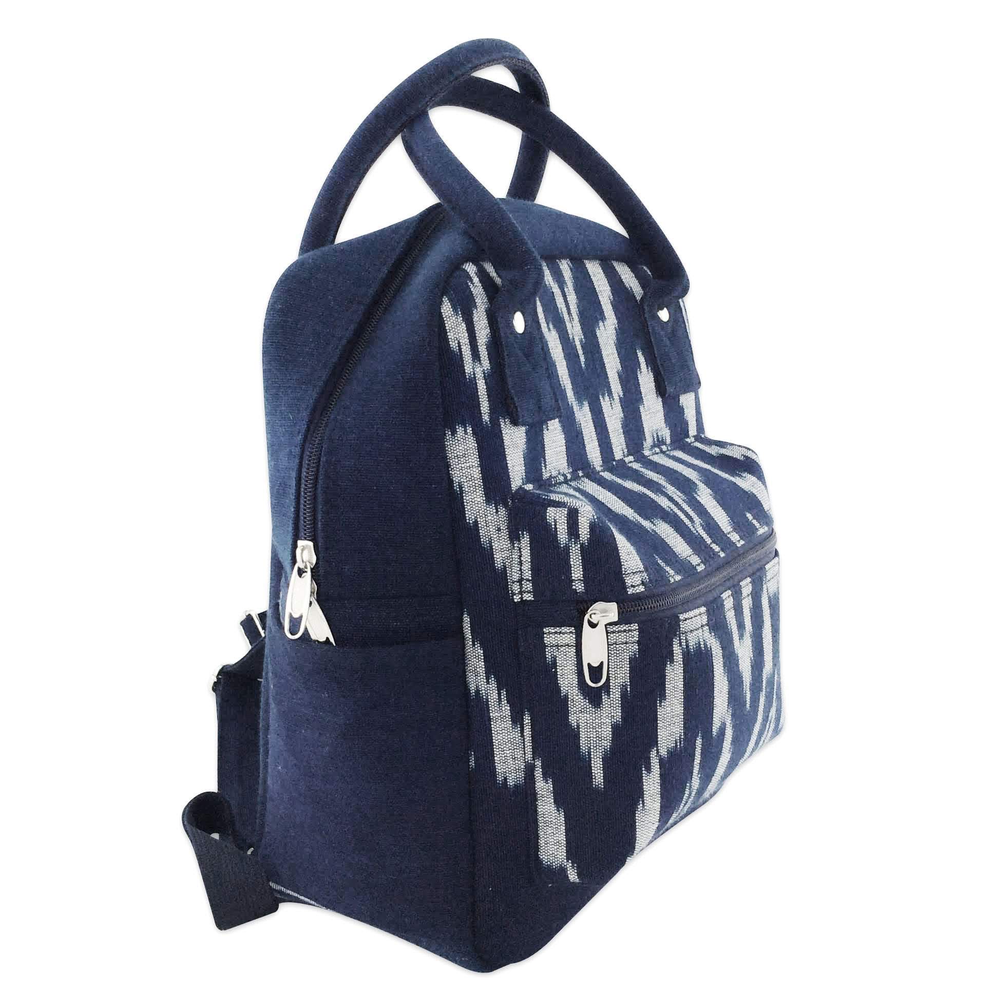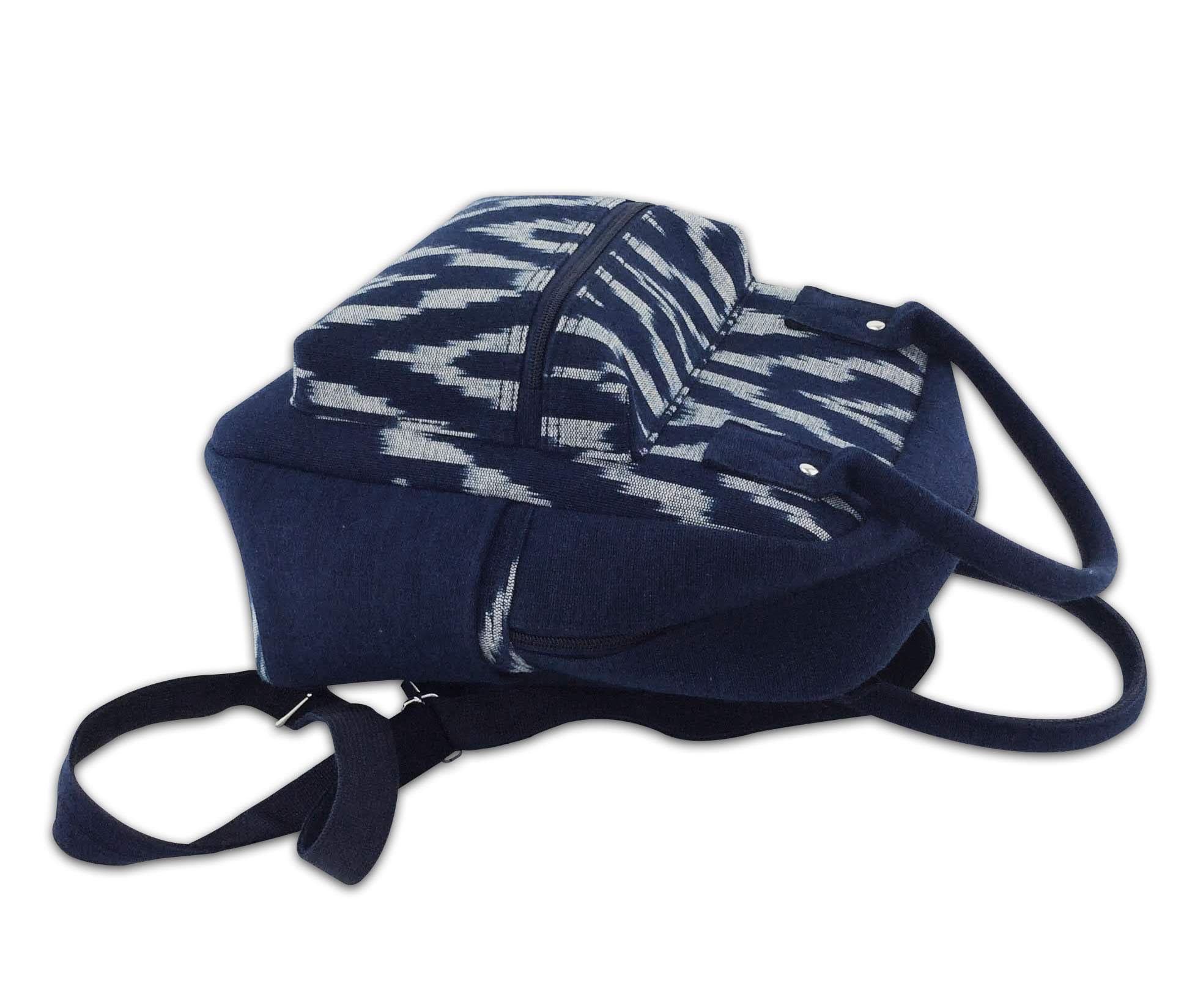 Es muy elegante, con una personalidad obvia específica de oficina. La tela azul tejida a mano con el diseño más sofisticado del mundo de las telas manuales, el ikat. El hilo está teñido con añil y con mucha habilidad para ser listo de pasar en el telar.